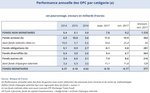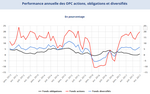 La performance annuelle des OPC non monétaires s’établit à 9,2% en octobre 2017 (+ 1,4 point par rapport au mois précédent), son niveau le plus élevé depuis juillet 2015 (10,3%). Elle progresse pour toutes les catégories de fonds, notamment les fonds actions (+ 2,4 points à 19,9 %), suivis des fonds diversifiés (+1,3 point à +6,7 %). La performance annuelle des fonds [a[obligations]a] redevient positive à +0,8 %.